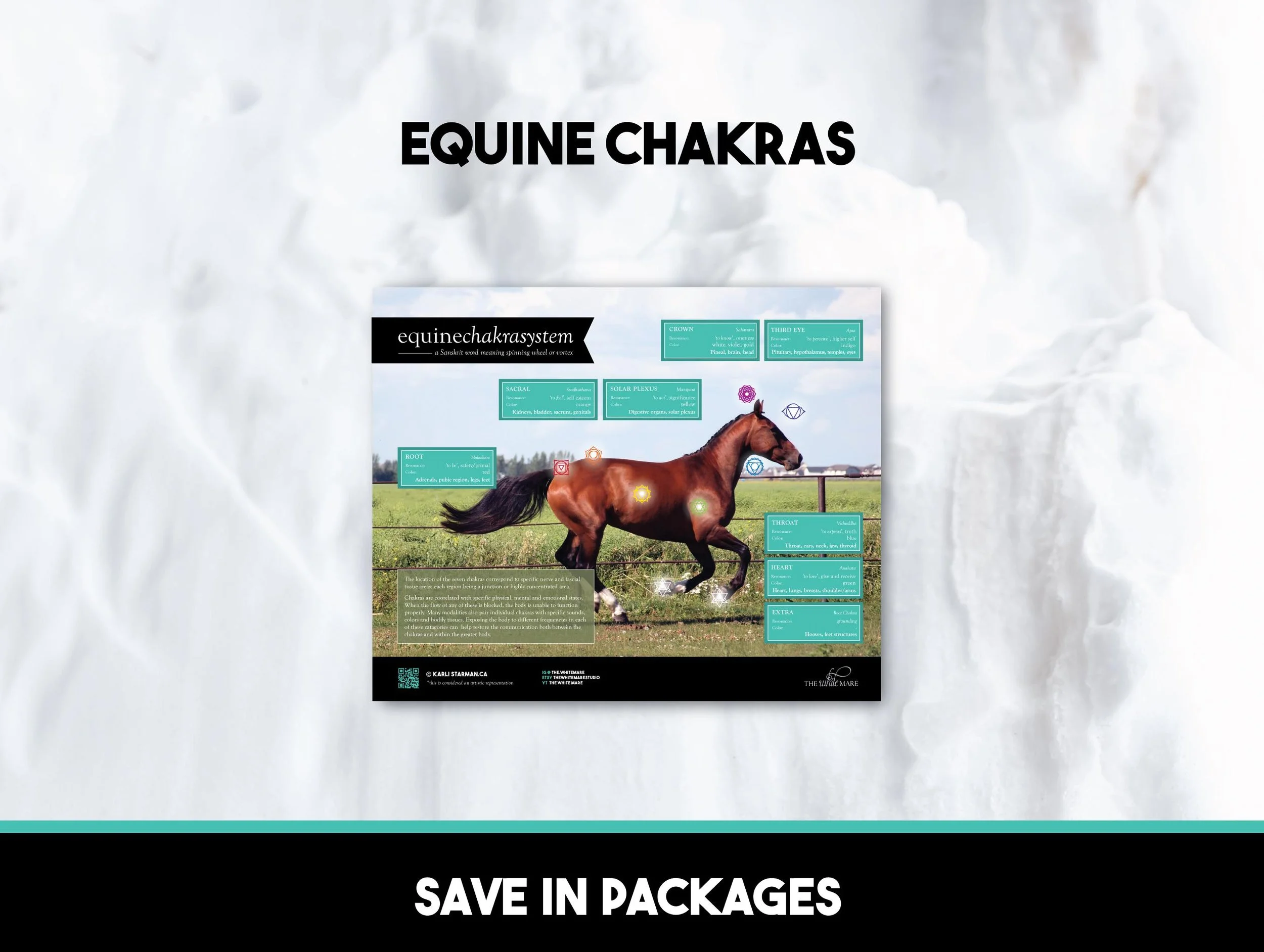This poster shows the locations for each of the equine/horse chakras, including all 7 main chakras plus 4 additional 'hoof' chakras. Additional details about associated organs, emotions, colors and more are also detailed.