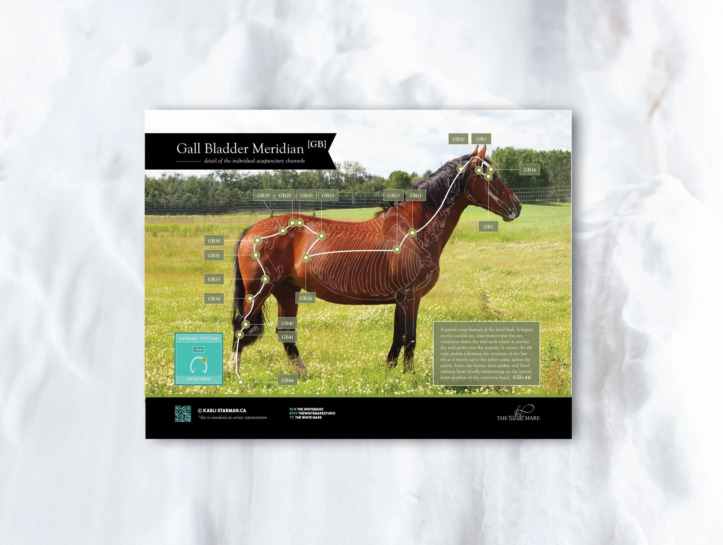 This single Equine Acupuncture poster details the GallBladder Channel (Gb). It is part of a larger equine anatomy series and can be purchased as a stand alone or in sets for savings. These sets are acupuncture specific or tailored to horse professionals such as therapists, trainers, owners and saddle fitters.